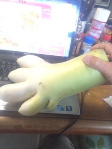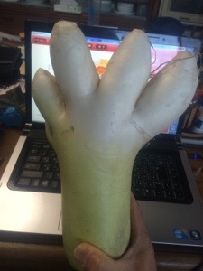 今日、家のおじいちゃんが畑でとれたともってきた大根! マジで?! 手みたい! いや足か?! (^^)