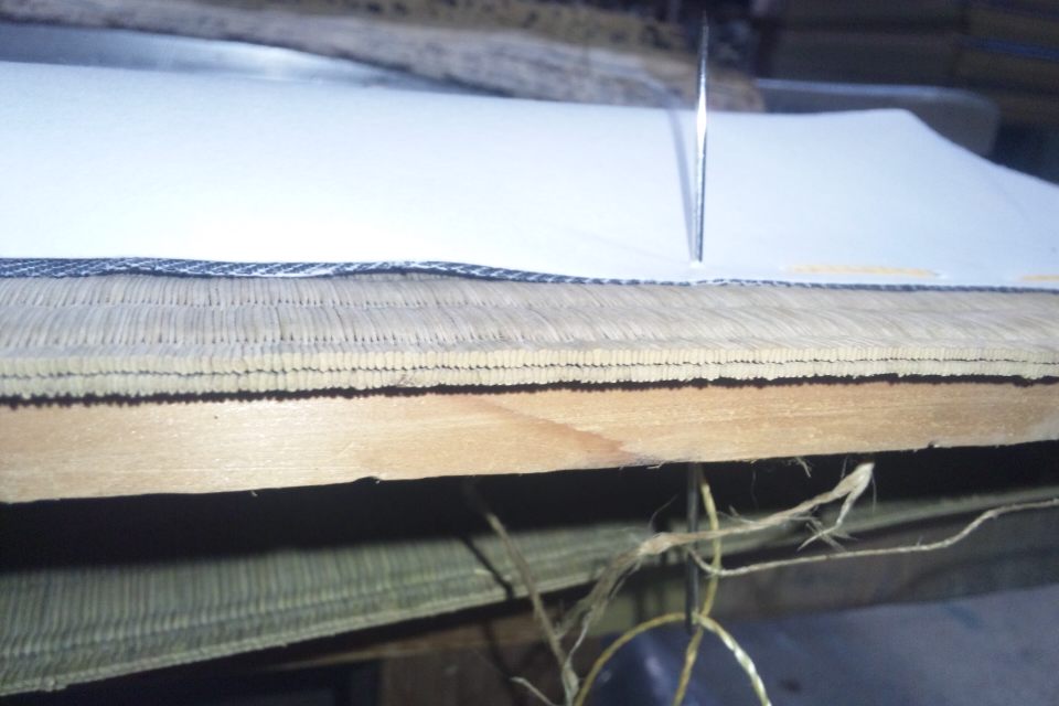 畳のござと木の板を一緒に縫うって