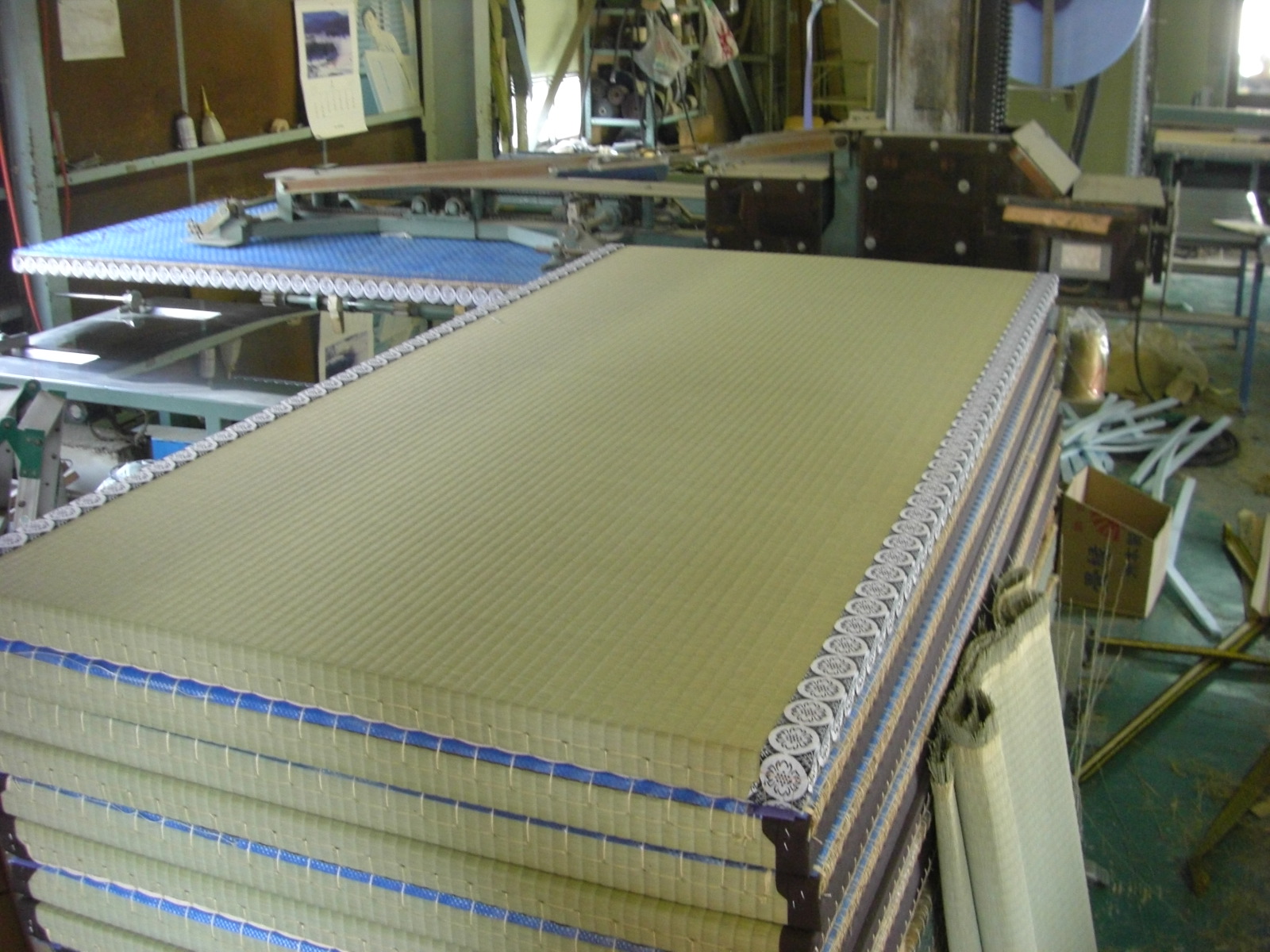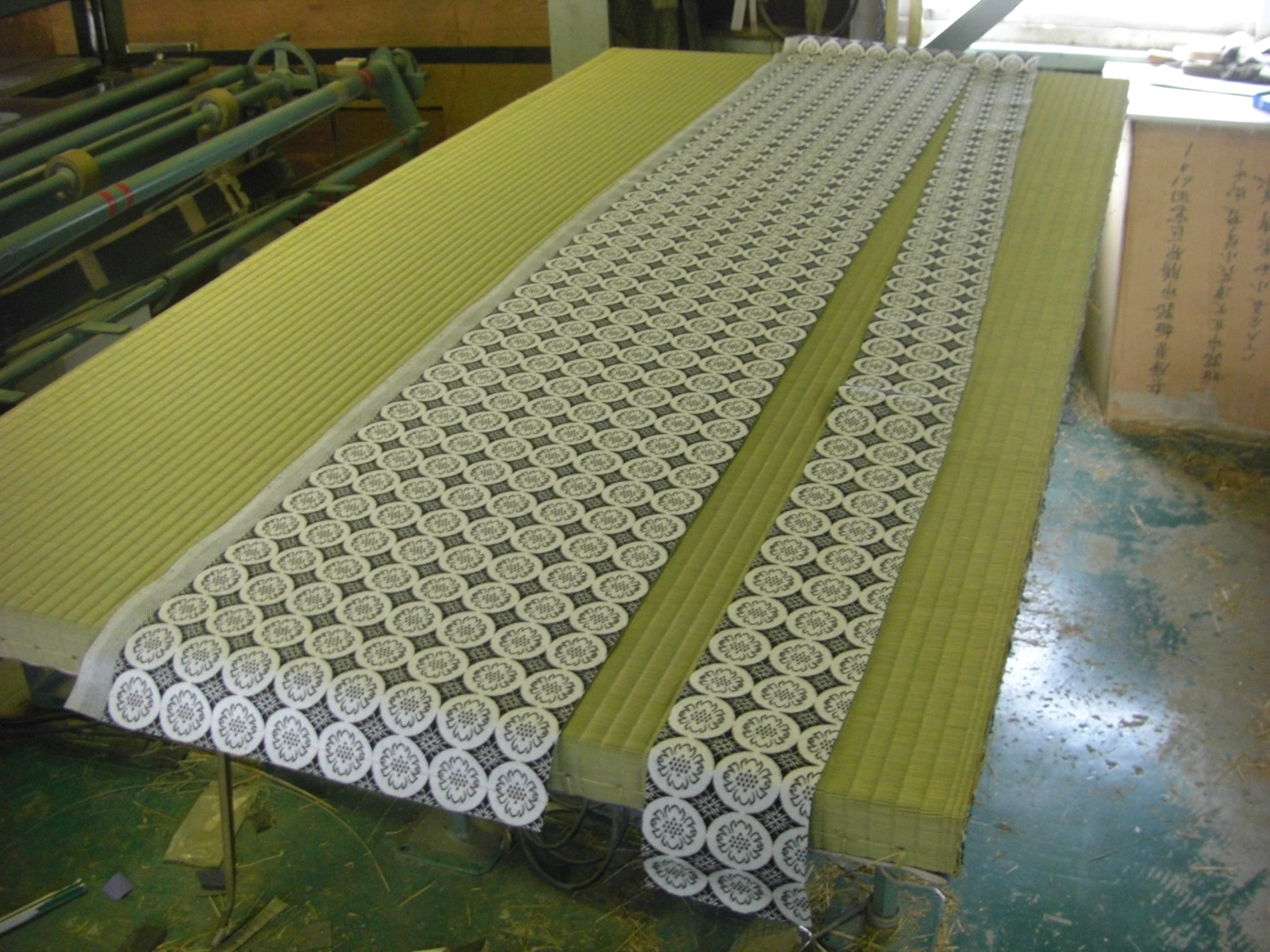 お寺の畳を施工中です 特に、紋縁の畳・・・・・ 畳縁を紋縁にするのですが この、紋、丸い模様を綺麗にだすのは 何回やっても、難しいです。